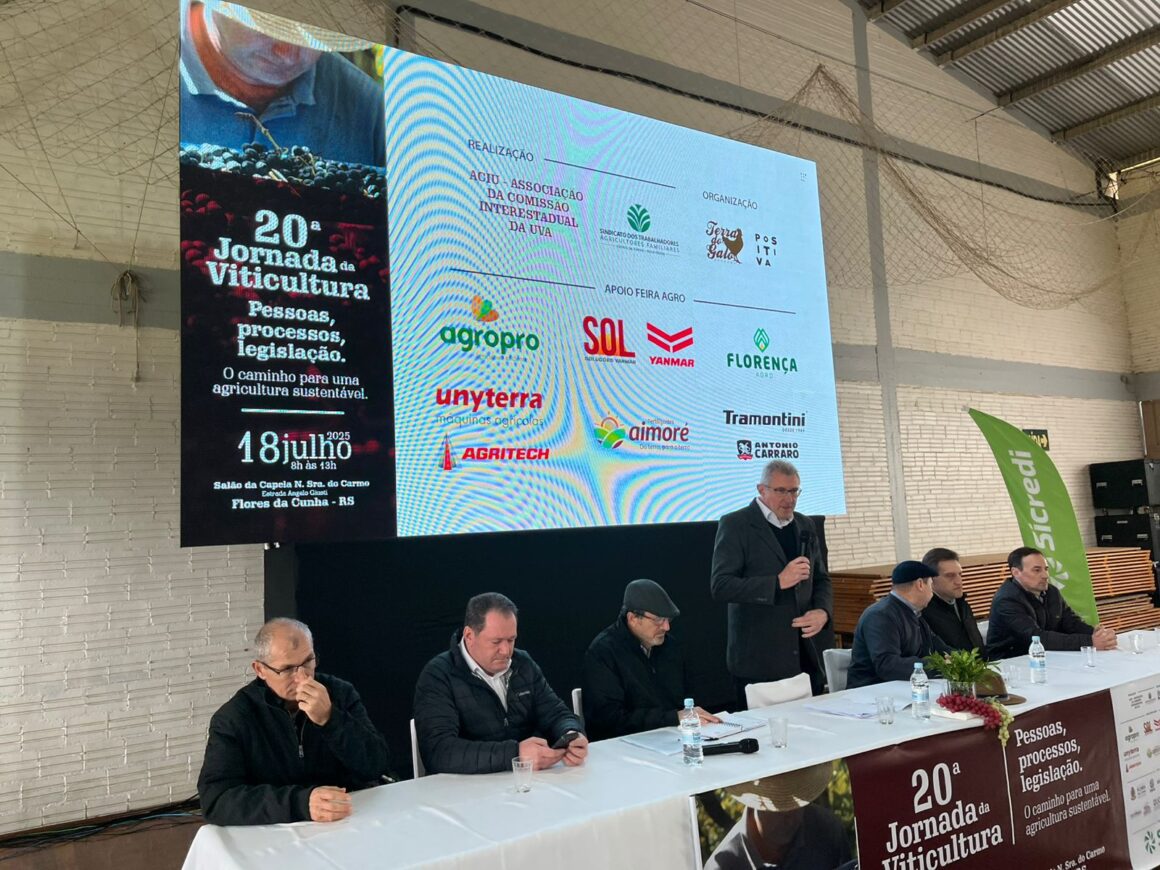 A 20ª Jornada da Viticultura encerrou nesta sexta-feira, em Flores da Cunha, com foco na profissionalização do setor e na flexibilização da legislação trabalhista rural. O evento reuniu cerca de 250 participantes no salão da Comunidade Nossa Senhora do Carmo, entre produtores, técnicos, parlamentares e representantes de entidades ligadas à vitivinicultura. De acordo com o coordenador da Comissão Interestadual da Uva, Ricardo Pagno, com o tema “Pessoas, processos e legislação – o caminho para uma agricultura sustentável”, a jornada destacou os avanços na gestão das propriedades e discutiu os principais desafios da agricultura familiar – principalmente na contratação de mão de obra.