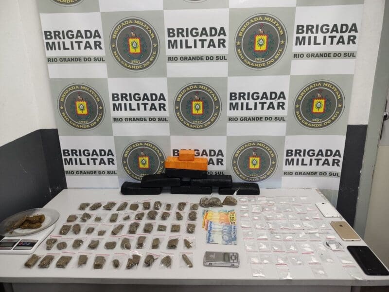 Com eles foram apreendidos 4,170 g de maconha, sendo oito tijolos e outras 53 porções menores, 59,45 g de cocaína em diversas porções, duas balanças de precisão, três celulares de marcas diversas, uma motocicleta, FAN 150 e R$ 228,00 em cédulas diversas.