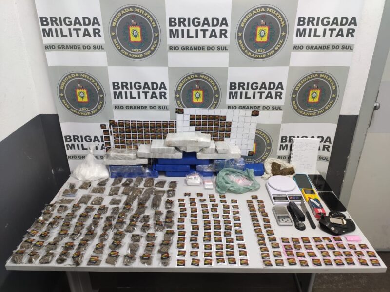 Durante um patrulhamento motorizado, equipes da Força Tática do 12º BPM abordaram um veículo, onde foram encontrados dois homens, um de 25 e outro de 27 anos, portando uma quantidade significativa de drogas. No interior do veículo foram apreendidos dez tijolos de maconha, totalizando 9,47kg, além de 513g de cocaína, 69 porções de substância semelhantes à anfetamina , 31 comprimidos de ecstasy e diversos outros materiais utilizados para pesagem e embalagem de drogas. Com isso, os suspeitos foram presos em flagrante pela Brigada Militar.