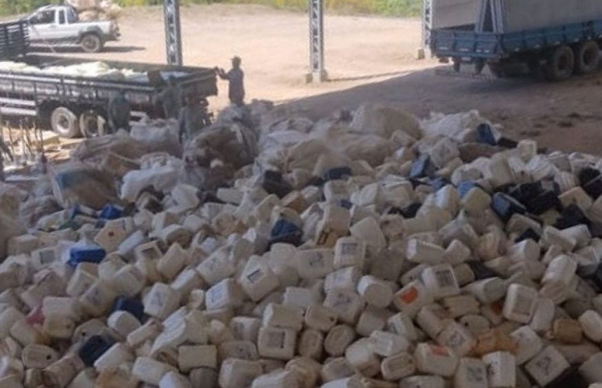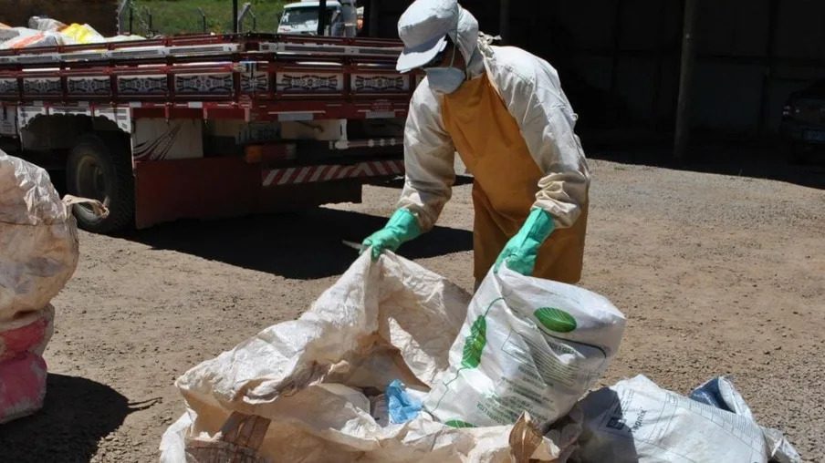 A orientação ainda é para que as tampas sejam colocadas em um saco separado e as embalagens flexíveis (saquinhos), não podem ser lavadas. Devem ser colocadas em um saco destinado só para embalagens flexíveis contaminadas e não podem ser misturadas as tampas ou embalagens lavadas. Não utilizar arame para amarrar embalagens e sacos. Já as caixas de papelão precisam ser desmontadas (abertas e empilhadas) e levar a relação de quantidade de embalagens por tamanho, (quantas de 1L, quantas de 5L, quantas de 20L, quantos sacos contaminados e quantas caixas de papelão).