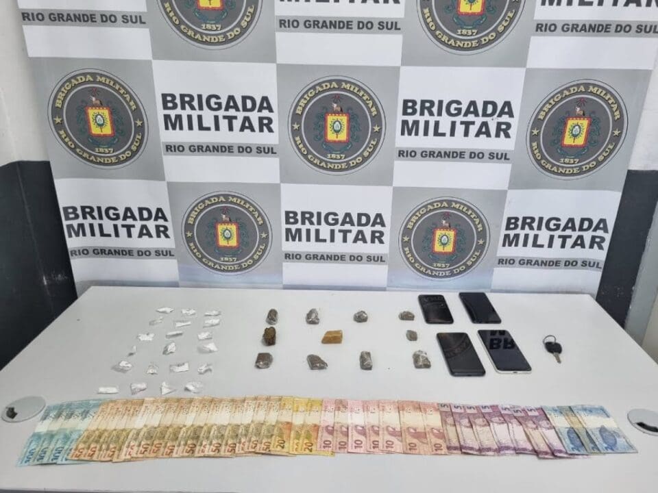 Em revista ao veículo, foi localizado no porta-luvas uma porção de crack e dinheiro. Já em revista pessoal, foi localizado no sutiã da mulher porções de cocaína. Questionados sobre o material ilícito, responderam que estariam indo até o bairro Serrano para abastecer um ponto de tráfico. Em buscas na residência, foram localizadas algumas porções de maconha em cima da geladeira.