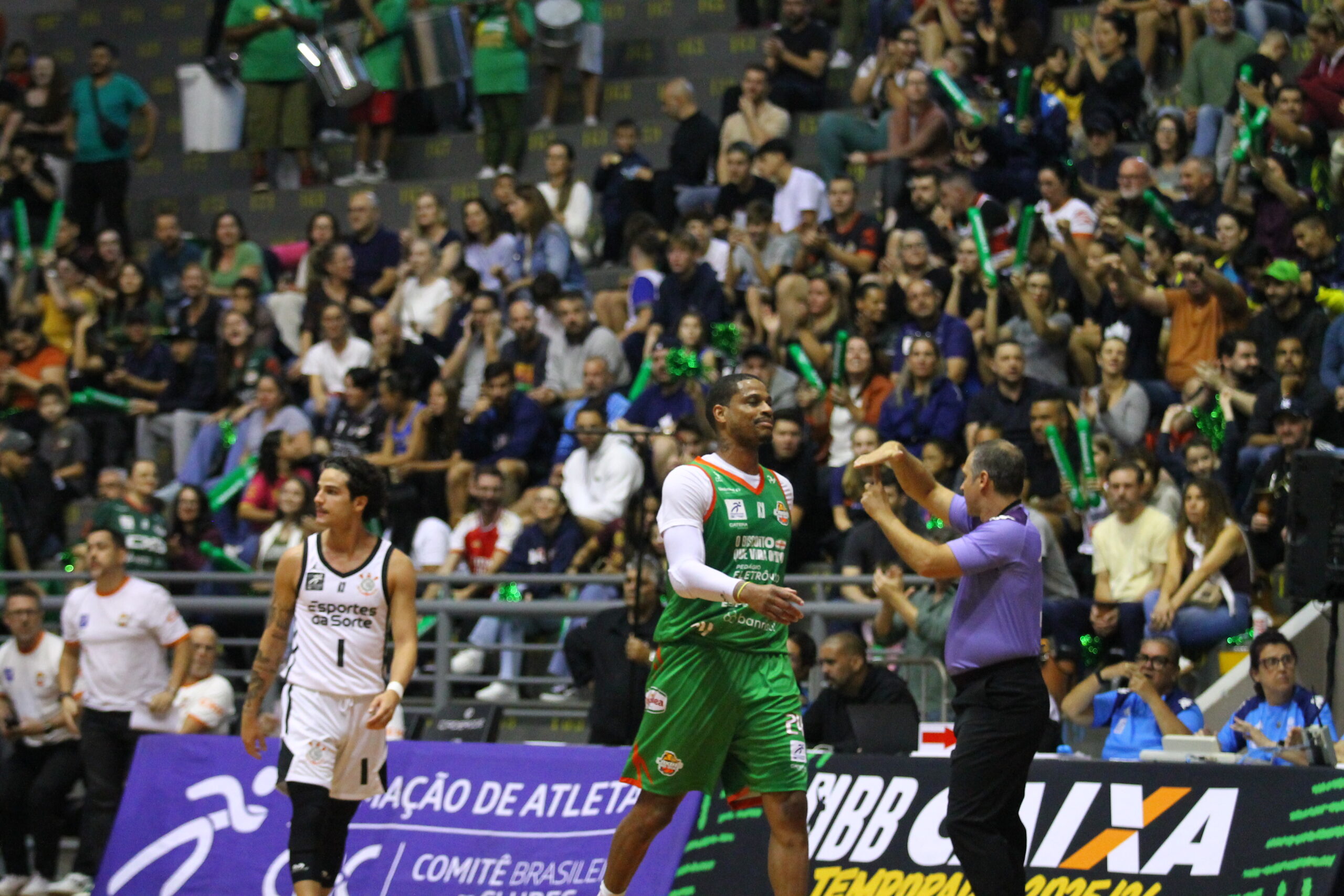 O terceiro quarto foi marcado por alto aproveitamento nas bolas de três. O Corinthians iniciou pontuando, enquanto o Caxias respondeu do perímetro (40×46). As equipes trocaram cestas, mas os visitantes mantiveram a vantagem. Com 03:40, após bola de três, o Corinthians abriu 11 pontos (50×61). O Caxias reagiu com duas bolas de três (54×61), levando Jesse Leite a pedir tempo técnico. Após a parada, o Corinthians voltou a converter do perímetro e ampliou novamente. Nos segundos finais, os visitantes acertaram mais uma bola de três, fechando o período com vantagem ampliada. Fim do terceiro quarto: 61×74.