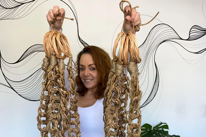 A artista caxiense explica que a peça é composta por fibra de bananeira, juta e vime.