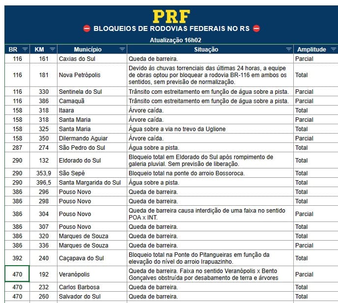 Os motoristas da Serra Gaúcha precisam redobrar a atenção nas rodovias estaduais e federais devido às fortes chuvas que atingiram a região na noite desta segunda-feira (29) e manhã desta terça-feira (30). Abaixo é possível conferir todos os pontos que estão com bloqueios totais ou parciais. A matéria será atualizada a cada novo envio dos órgãos rodoviários.