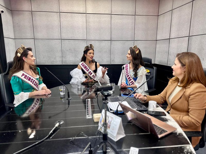 Coroadas no último sábado (23), o reinado das representantes da 35ª edição da Festa Nacional da Uva começou oficialmente nesta segunda-feira com os primeiros compromissos como rainha e princesas. Pela manhã, a eleita rainha Elisa dos Santos Pereira D’Mutti, representante da Sociedade Esportiva e Recreativa Caxias do Sul (Ser Caxias) e Vinhedos Papéis, concedeu entrevista ao Jornal da Caxias, na 93,5 FM. Durante a tarde foi a vez do programa Repertório receber o trio, composto por ela e pelas duas princesas, Júlia Dalegrave Scopel (Recreio da Juventude) e Letícia Comin da Silva (CDL Caxias, Sindigêneros e Sindilojas Caxias).