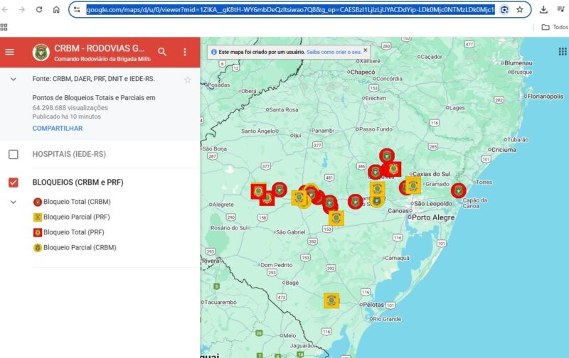 • \#CRBM #RodoviasRS #BloqueiosRS #TrânsitoRS #MapaInterativo #SegurançaViária #RádioCaxias #RodoviasBloqueadas #RS #BR #TransitoSeguro