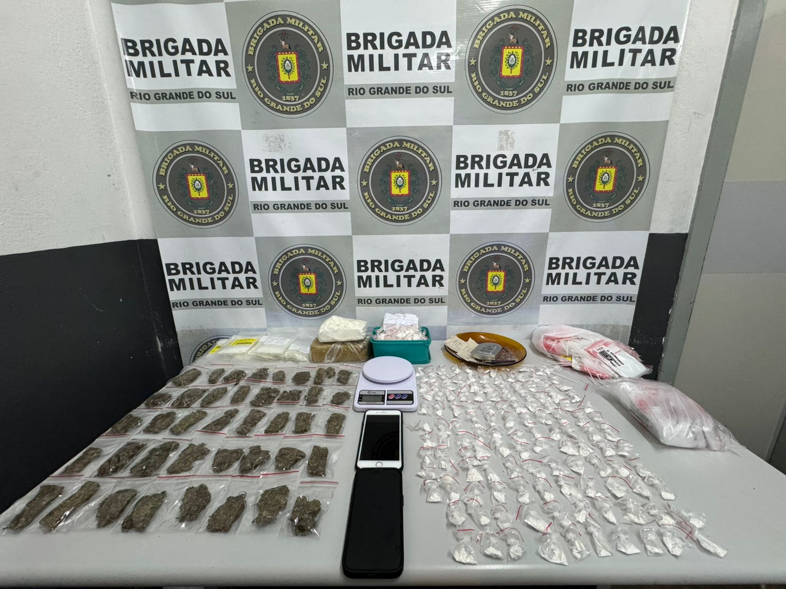 Durante a ação os policiais localizaram 248 porções de cocaína, 41 porções e um tijolo de maconha, balanças de precisão, celulares e uma motocicleta.