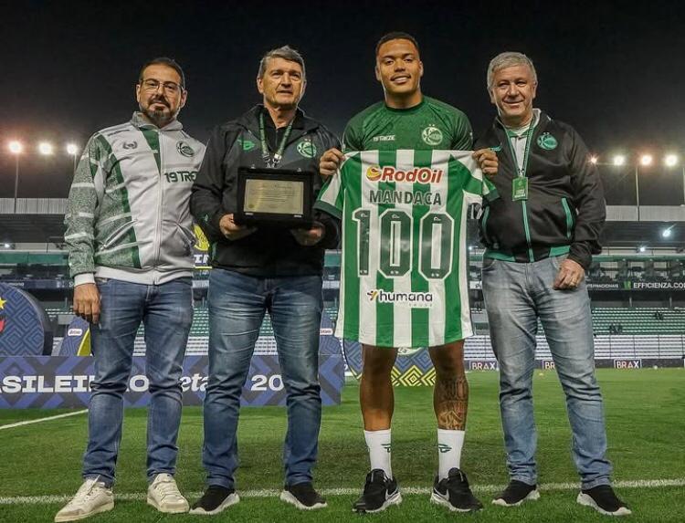 O volante Mandaca completou 100 jogos com a camisa do Juventude no duelo contra o Sport, na última segunda-feira (14), no estádio Alfredo Jaconi. Com isso, o atleta recebeu homenagens da direção alviverde, uma placa e uma camisa fazendo referência ao número de jogos defendendo o Juventude.