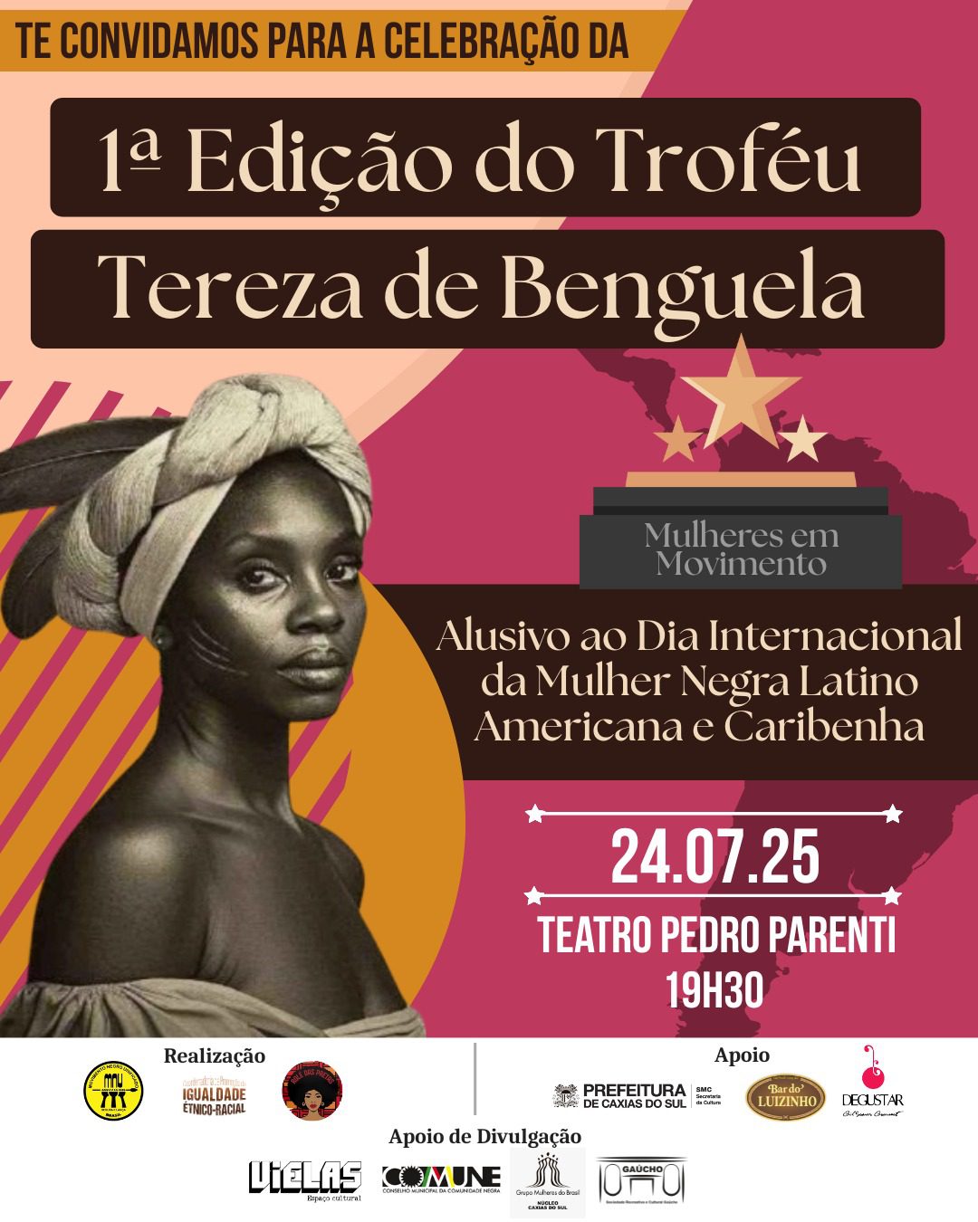 Em alusão à data, a exposição “Tereza de Benguela e a Mulher Negra” ocupa o Espaço Cultural Mário Crosa, no subsolo da Câmara de Vereadores de Caxias do Sul. A mostra — aberta à visitação gratuita até o dia 28 de julho, de segunda a sexta-feira, das 8h às 17h — celebra a ancestralidade e a força das mulheres negras por meio de uma curadoria composta por pinturas, roupas, acessórios e peças artesanais.