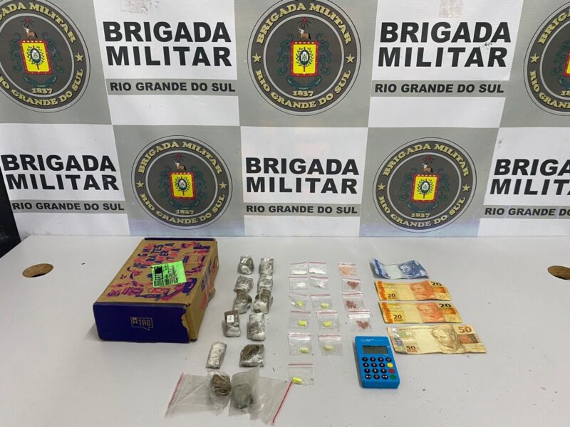 Durante a abordagem, foram apreendidas porções de maconha, cocaína, ecstasy, MD, além de uma maquininha de cartão e R$ 92,00 em dinheiro.