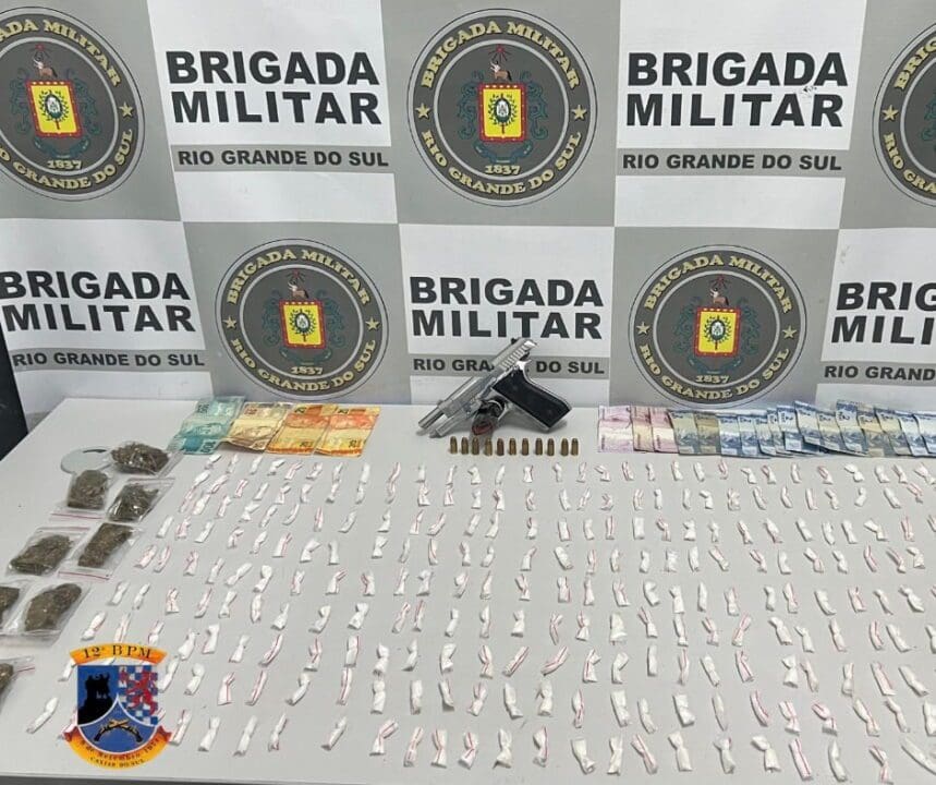 Na abordagem foi identificado um homem de 32 anos com antecedentes por homicídio, lesão corporal, vias de fato e porte ilegal de arma de fogo, na revista veicular, foram localizados uma Pistola Cal. 380 Taurus, 11 munições calibre 380, 274 porções de cocaína (189,35g), 09 porções de maconha pesando 114,50 g, o valor de R$ 233,00 e um telefone celular da marca Samsung.