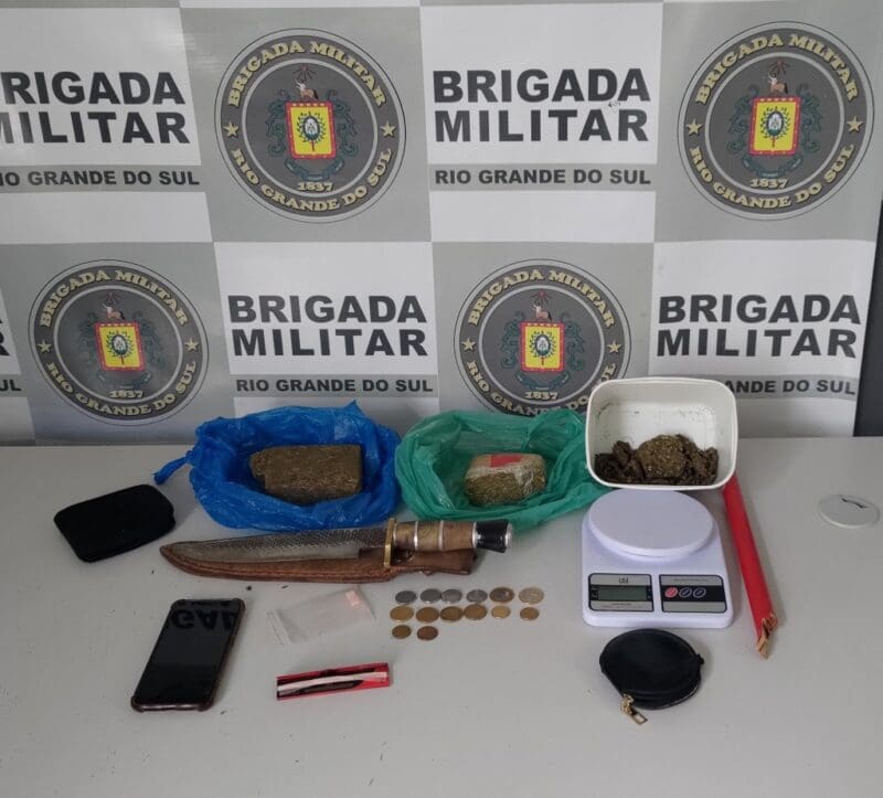 Em revista pessoal, encontraram no interior de uma mochila, dois tijolos de maconha, porções pequenas da mesma substância entorpecente, dinheiro e uma faca.