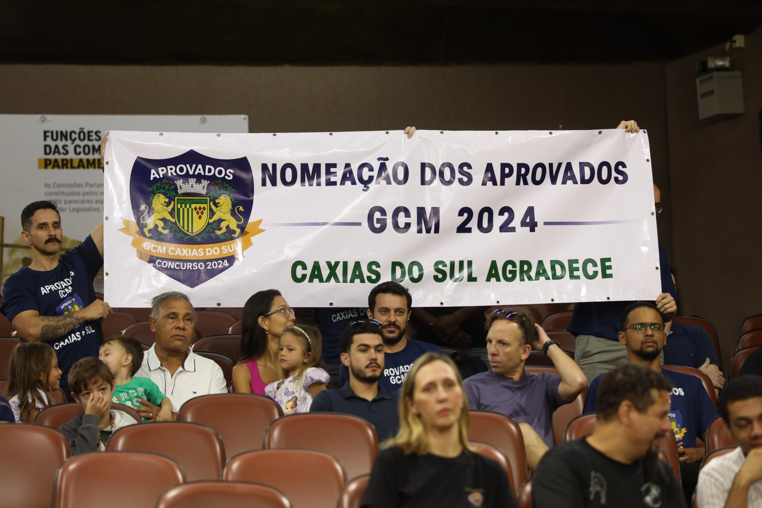 Enquanto os vereadores externavam opiniões, candidatos que se encontram na lista para serem chamados para as vagas de guardas estiveram na plateia com uma faixa, pedindo a nomeação de quem passou no concurso em 2024.
