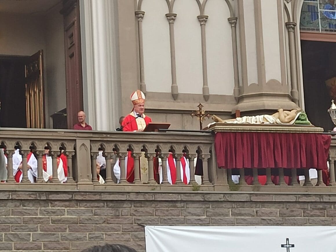 A multidão se reuniu após a procissão, em frete a Catedral, para ouvir a homilia de Dom José Gislon, que falou sobre fé, amor e oração com Cristo.