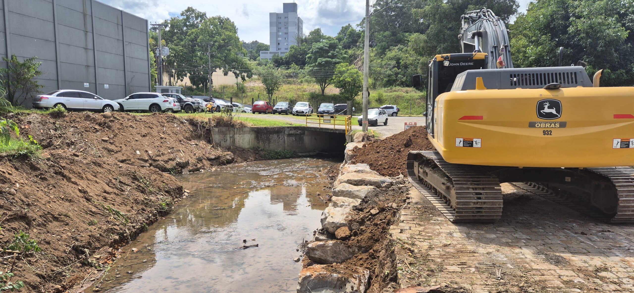 A Prefeitura de Caxias do Sul, por meio da Secretaria Municipal de Obras (SMO), executa uma obra de reconstrução da margem de um canal de condução de águas pluviais na Rua Centauro, esquina com a Rua Padre Raul Accorsi, no bairro Cruzeiro. Os trabalhos têm como objetivo principal estabilizar um trecho da via lindeiro ao canal, que vinha sofrendo processo contínuo de erosão e desbarrancamento.
